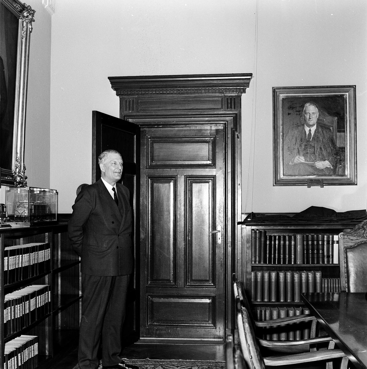 Vid generaldirektör Statens Järnvägar, SJ, Erik Upmarks avgång. Upmark poserar vid sitt porträtt i Plenisalen