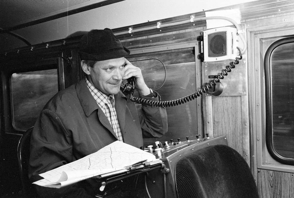Spårbyte i midnattssol, natten 23-24/6 i Kiruna. Dressin med tågradio. Vid telefonen Anders Gröndal.