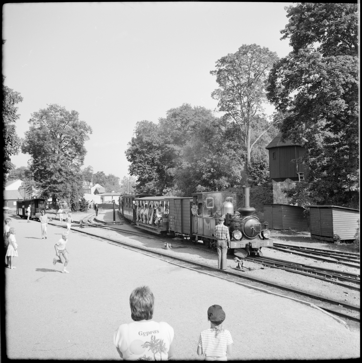 Museijärnvägen, Östra Södermanlands Järnväg, ÖSlJ Stafsjö Järnväg lok 2 "Virå", Anneberg - Ormaryds Järnväg, AOJ G 3, Helsingborg - Råå - Ramlösa Järnväg, HRRJ Coö 6 med resande på stationen i Mariefred.