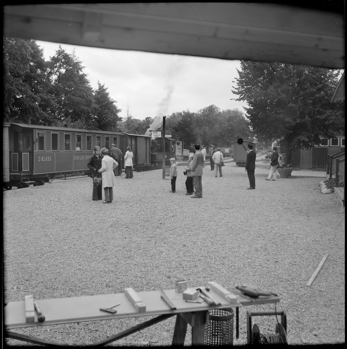 Museijärnvägen, Östra Södermanlands Järnväg, ÖSlJ ångtåg med lok 8 "Emsfors", Kosta - Lessebo Järnväg, KLJ G 29 och Stafsjö Järnväg kombinerad 2:a och 3:e klass vagn samt resande på stationen i Mariefred.