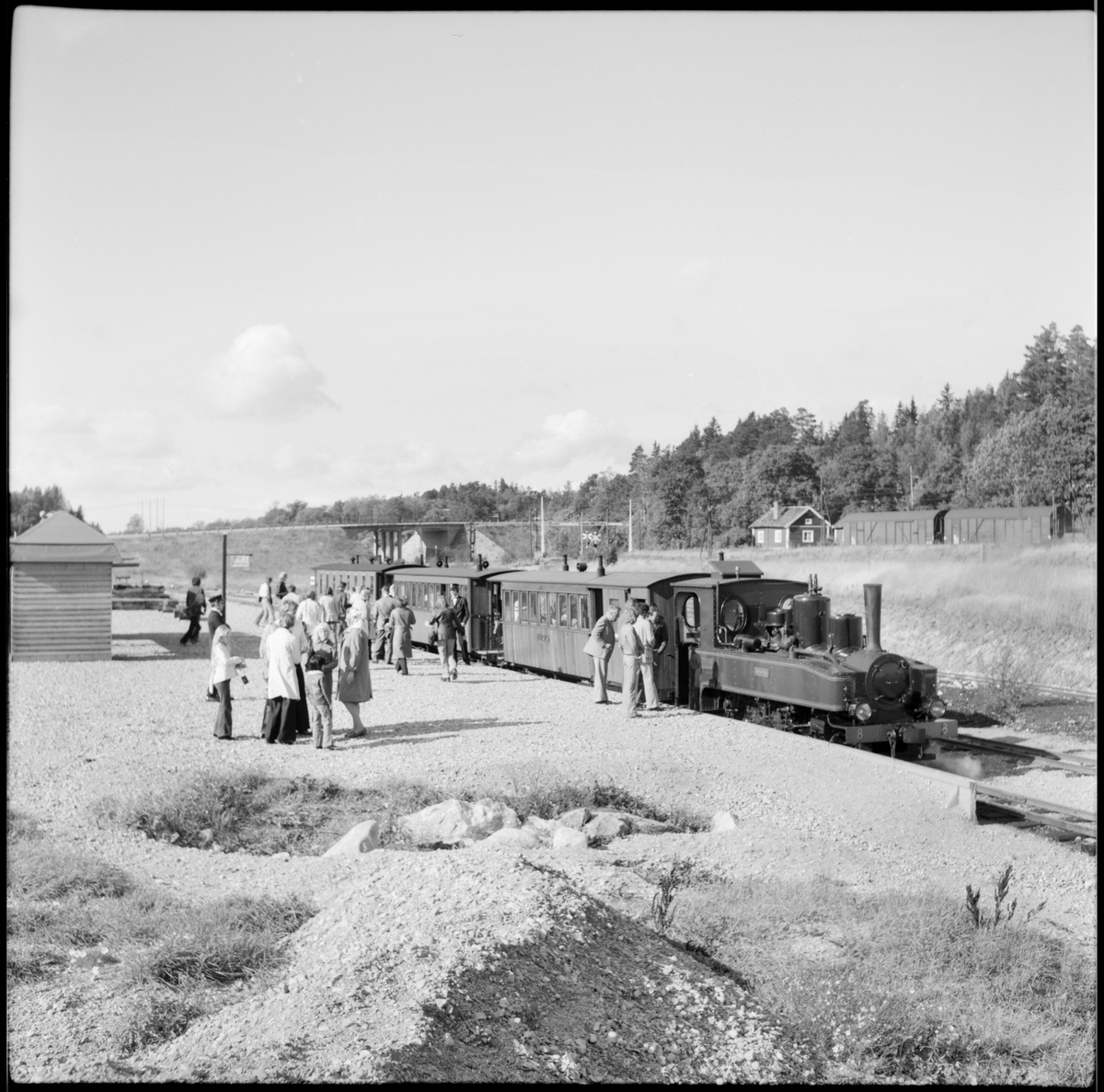 Ångtåg med lok 8 "Emsfors" och Helsingborg - Råå - Ramlösa Järnväg, HRRJ personvagn vid Läggesta Södra station dit Museijärnvägen, Östra Södermanlands Järnväg, ÖSlJ har förlängt bansträckningen. Stationshuset ses till vänster i bild.
