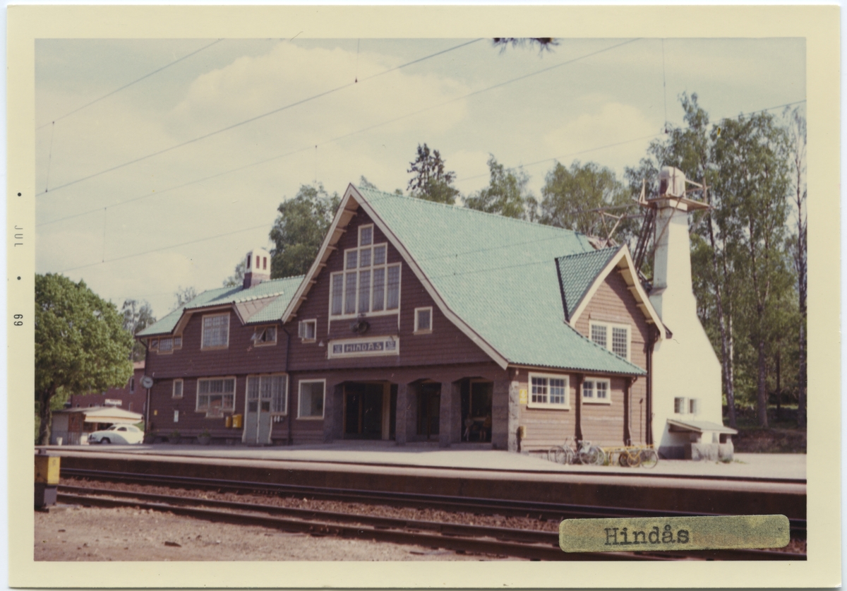 Vy vid Hindås stationshus.Vagnslasttrafiken upphörde fr o m 31 maj 1964 och styckegodshanteringen fr o m 22 maj 1977. Stationen är sedan 1993 fjärrstyrd från Göteborg. Byggd 1908 efter förslag av arkitekt Yngve Rasmussen i Göteborg