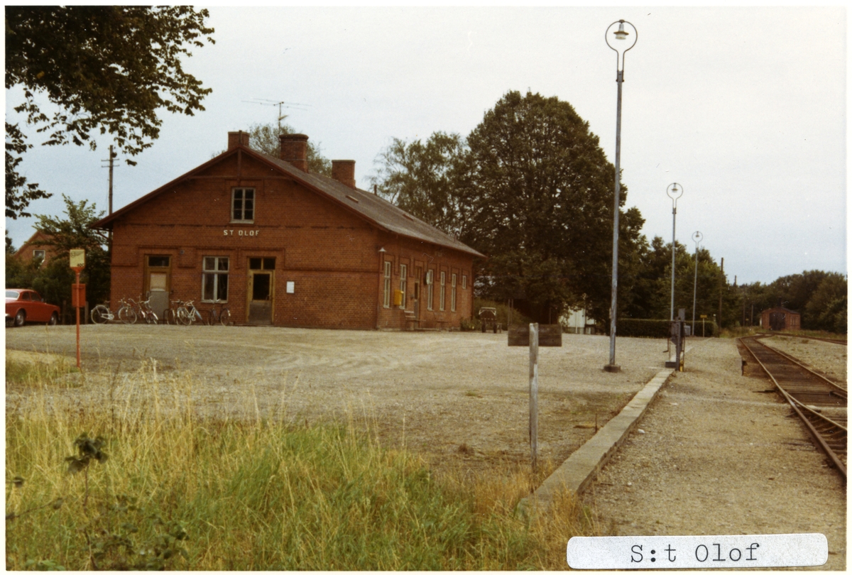 S:t Olof station 1971. Ystad - Brösarps Järnväg, YBJ. Stationen öppnades 1901. Stationshuset byggdes 1901. Sedan 1971 används stationen av museibanan. Gick över till Statens Järnvägar, SJ 1941. Banan elektrifierades 1996.