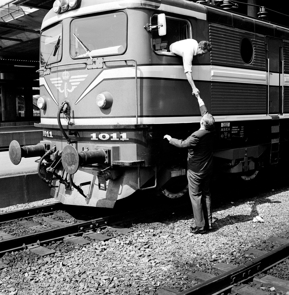 Statens Järnvägar SJ Rc 1011. Vid generaldirektör Statens Järnvägar, SJ, Erik Upmarks avgång. Gd Upmark och lokföraren Ingvar Einarsson, Hagalund