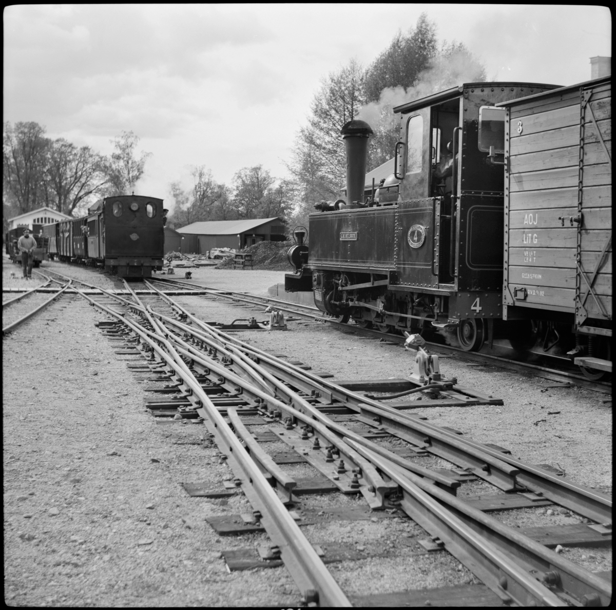 Östra Södermanlands museijärnväg. Närmast i bild; ånglok Nättraby-Alnaryd-Elmeboda Järnväg, NAEJ 4 "K M Nelson" med godsvagn Anneberg - Ormaryds Järnväg, AOJ G 3. Till vänster i bild syns Östra Södermanlands Järnväg, ÖSIJ 5 "Hamra" med personvagnar. Klotväxel.