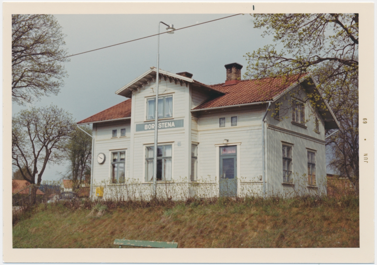 Vy vid Borgstena. Stationen öppnad 1863. Tvåvånings stationshus i trä byggt 1898 enligt arkitekt L Kernuant ritningar. Obemannad sedan 28 maj 1978. Stationshuset sålt som privatbostad. Det är nu ersatt av en enkel väntkur på plattformen. Station anlagd 1863. Mekanisk växelförregling