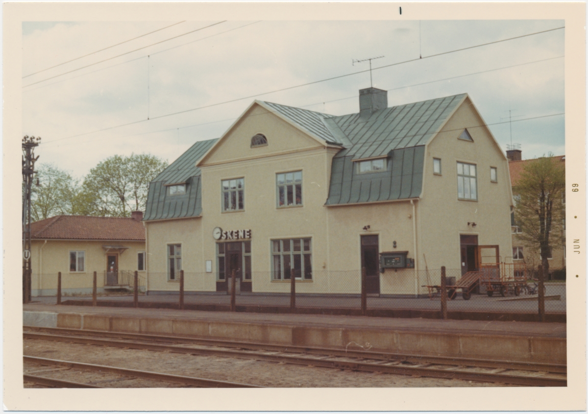 Vy vid Skene.Station anlagd 1880. Stationshus i två våningar byggt i tegel gult, putsat hus byggt 1914 av arkitekt Harald Söderberg, Varberg. Mindre inre ombyggnad 1915, och 1950 renoverades fastigheten.För resenärerna finns en hållplats med plastkur alldeles norr om stationshuset Elektrisk växelförregling