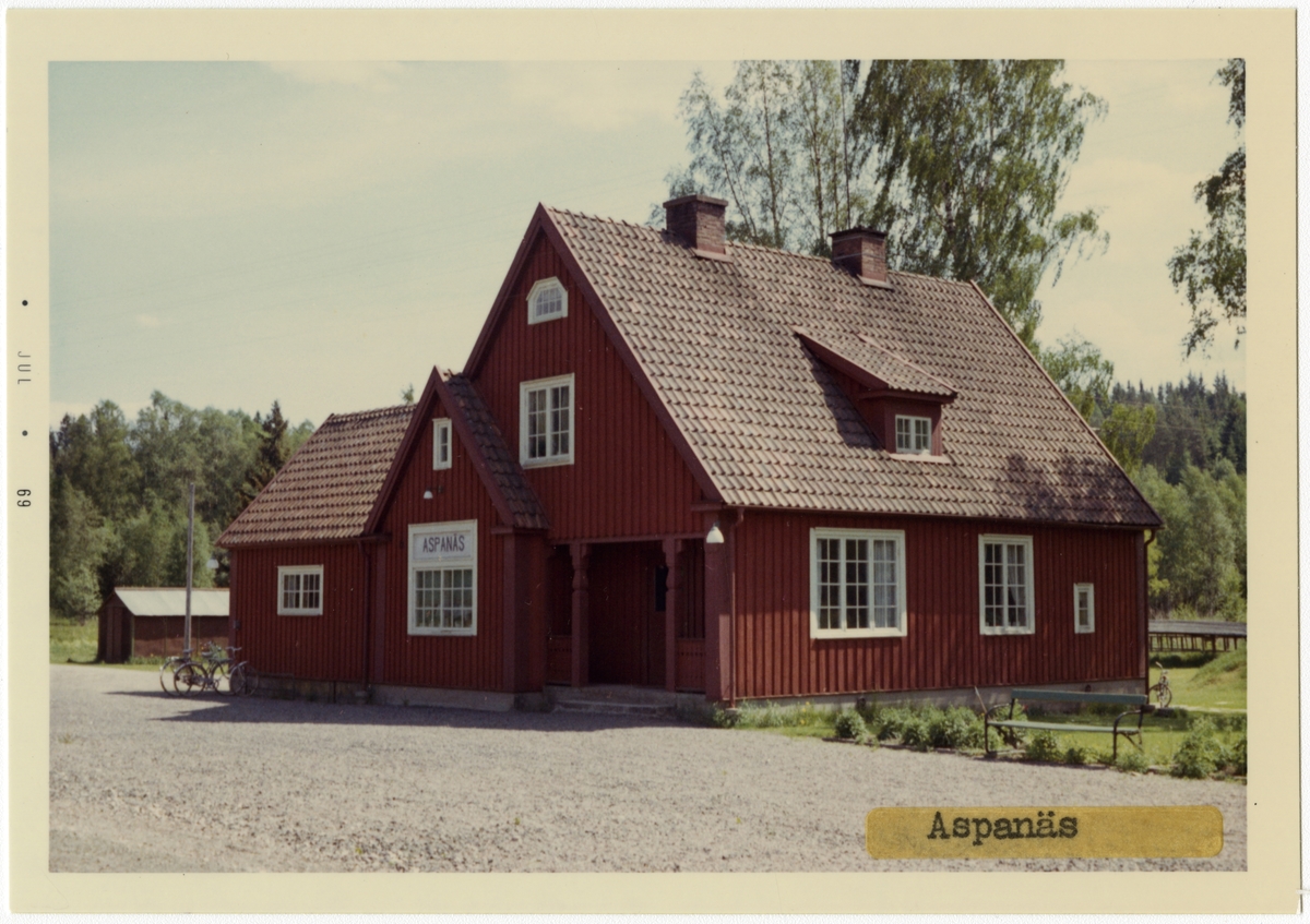 Vy vid Aspanäs. Håll- och lastplats öppnad med banan 1917. En- och en halv vånings stationshus i trä bygggt Enligt ritningar av arkitekt Rudolf Lange, Göteborg. Väntkur uppsattes vid avbemanningen. Godstrafiken upphörde under 1960-talet, medan persontrafiken var kvar till banans nedläggning 1985. Hållplats anlagd 1917. Mekanisk växelförregling, kontrollås