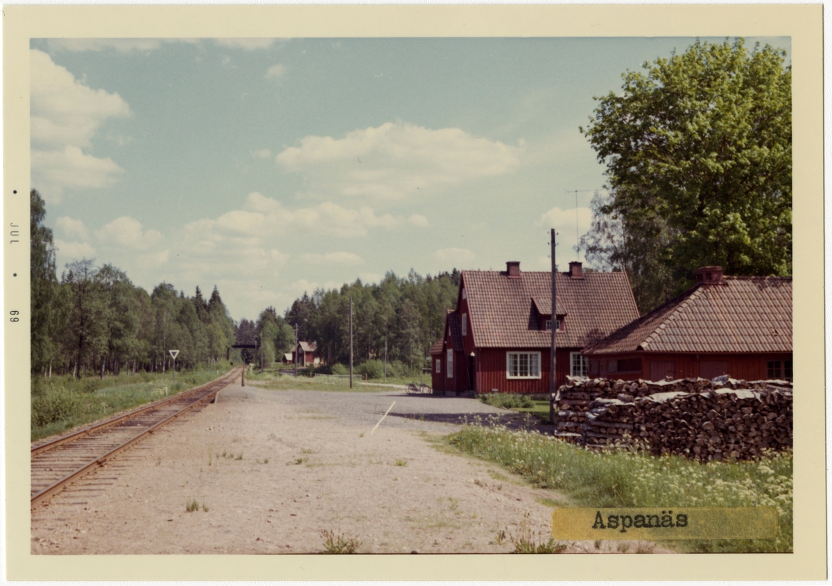 Vy vid Aspanäs. Håll- och lastplats öppnad med banan 1917. En- och en halv vånings stationshus i trä bygggt Enligt ritningar av arkitekt Rudolf Lange, Göteborg. Väntkur uppsattes vid avbemanningen. Godstrafiken upphörde under 1960-talet, medan persontrafiken var kvar till banans nedläggning 1985. Hållplats anlagd 1917. Mekanisk växelförregling.