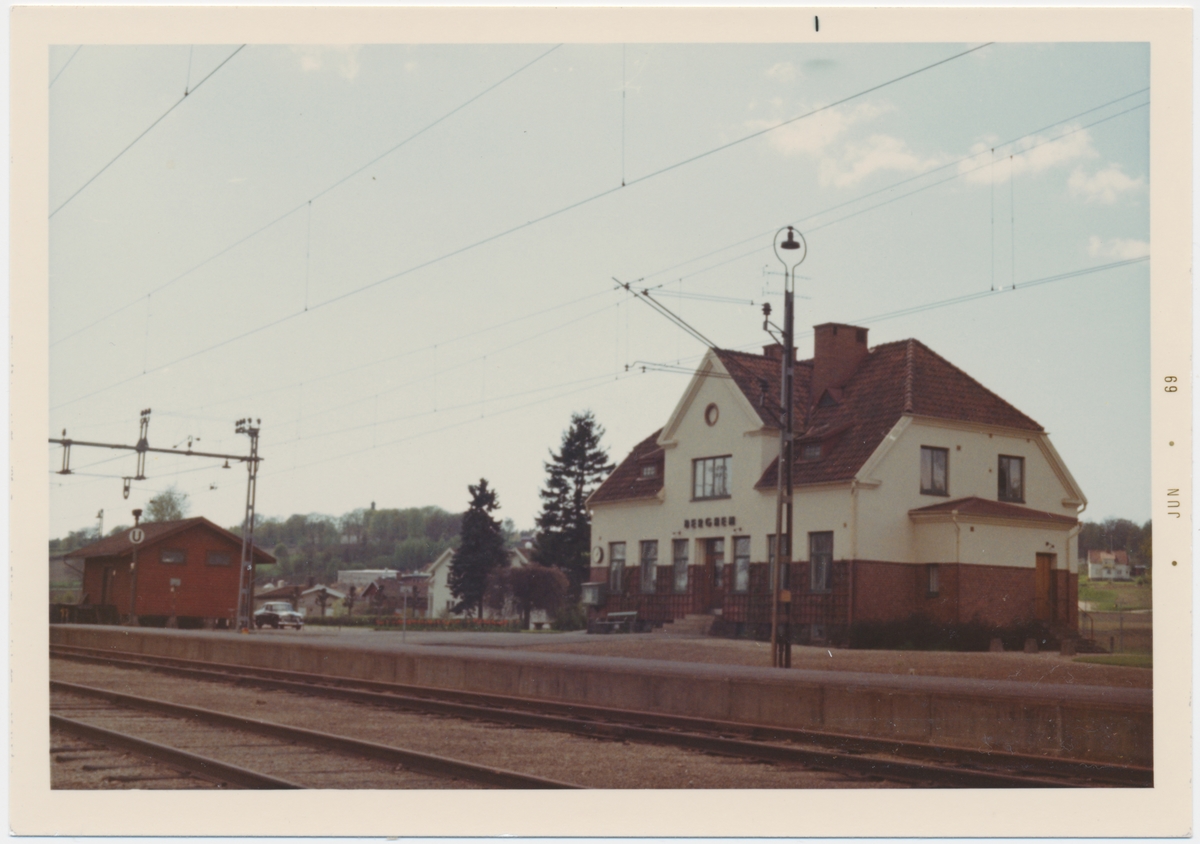 Vy vid Berghem.Trafikplats anlagd 1918. Tvåvånings putsad stationsbyggnad byggt enligt ritningar av arkitekt Harald Söderberg, Varberg. Elektrisk växelförregling anordnad 1945 . Privatägt, välbevarat hus i 1 1/2 plan med stationsnamnsskylt på spårsidan.Resenärerna hänvisas i dag till en hållplats med plastkur strax söder om stationshuset.Både hållplatsen och stationshuset ligger på spårets västra sida.