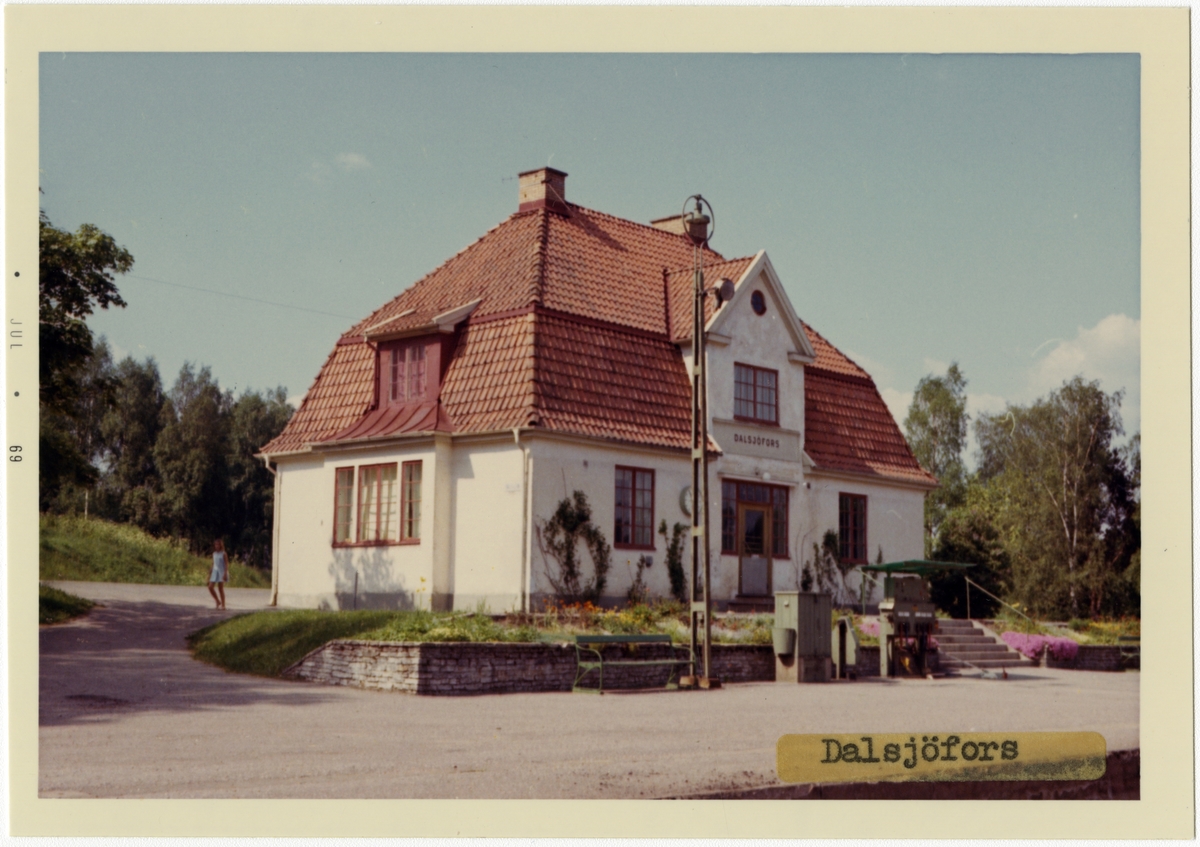 Vy vid Dalsjöfors. Stationen ritad av arkitekt Rudolf Lange och öppnad 1917. En- och enhalvvånings putsat stationshus. 1936 ombyggdes väntsal och expedition. Avbemannad från årsskiftet 1974/75, 1980 nedklassat som hållplats. Stationshuset revs sommaren 1982. Stationshuset ersattes efter rivningen av en öppen busskur. Station anlagd 1917.