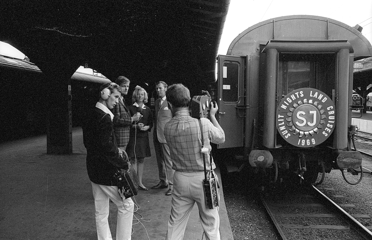 Sista SNLC-tåget anländer till Centralstationen. SNLC - Sunlit Nights Land Cruises. Tågvärdinnan Catharina Ramfors och tågvärden Åke Hagström intervjuvas och filmas