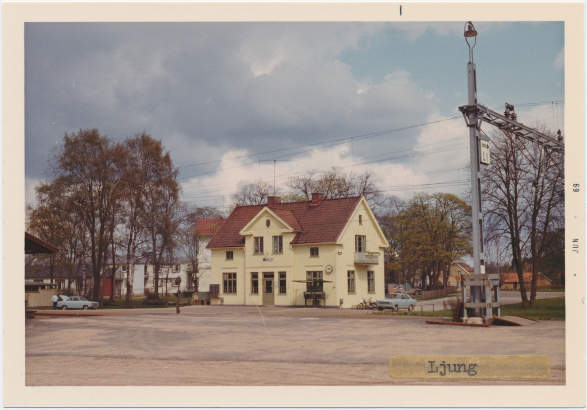 Vy vid Ljung. Station från 1863. Trästationshus i två våningar. 1924 nytt stationshus byggt enligt arkitekt L Kernuant. Det gamla huset revs, men byggdes upp som privatvilla ett par hundra meter från dess gamla plats. Det nya huset var av trä med putsad fasad. Stationen avbemannad från 28 maj 1978. Stationshuset uthyrs. En enkel väntkur finns på plattformen. Station anlagd 1898. Mekanisk växelförregling