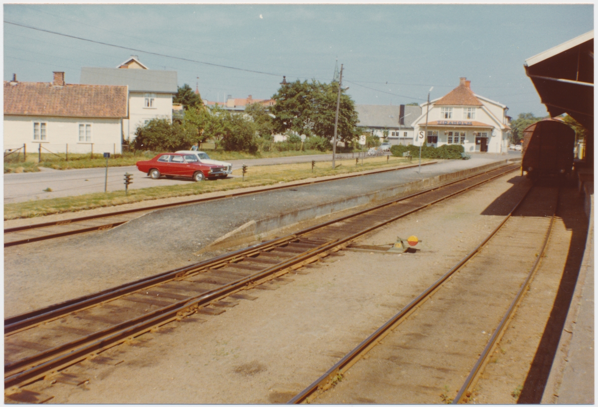 Titel: HSJ hade en egen station fram till 1907/08 då en gemensam station byggdes Bråket mellan bolagen innan den nya stationen kom till finns skildrad i Skara Järnvägsblad 2/95. HSJ gamla stationshus transporterades bort och använddes som bostadshus. HSJ gamla godsmagasin revs vid den nya stationens byggnad och ersattes med ett nytt 'prydligt målat i rött, vitt och grönt' (Skara Järnvägsblad 95/2) Station anlagd 1874. Stationshuset ombyggdes helt 1923, två våningar i trä. HSJ , Hjo - Stentorps Järnväg