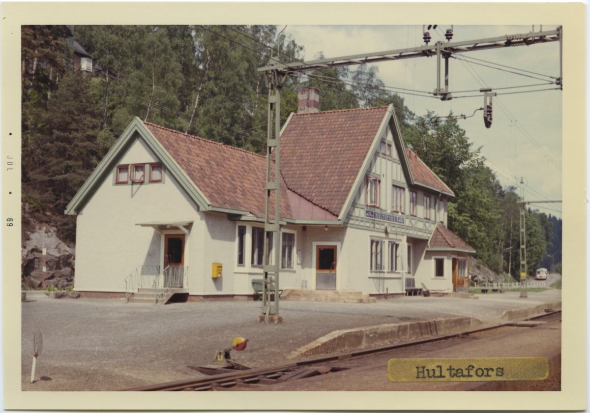 Vy vid Hultafors. Stationen anlades 1893. Tvåvånings station i korsvirkesstil. Mekanisk växelförregling.Till att börja med fanns här en inofficiell hållplats, 1896 officiellt en håll- och lastplats med en mindre träbyggnad. 1908 uppfördes ett nytt tvåvånings stationshus i korsvirkesstil och godsmagasinet tillbyggdes. Det nya stationshuset är ritat av arkitekt Yngve Rasmussen från Göteborg.Stationen avbemannad fr 23 maj 1971, då godstrafiken nedlades. Fr o m 16 juni 1980 indrogs även uppehållen för persontågen. Stationshuset blev efter avbemanningen personalbostad åt Hultafors Hälsocenter. 1986 övertogs det av Hultafors intresse- och bygdegårdsförening, som nu återställer byggnaden till ursprungligt skick.