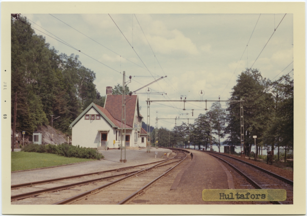 Vy vid Hultafors. Stationen anlades 1893. Tvåvånings station i korsvirkesstil. Mekanisk växelförregling.Till att börja med fanns här en inofficiell hållplats, 1896 officiellt en håll- och lastplats med en mindre träbyggnad. 1908 uppfördes ett nytt tvåvånings stationshus i korsvirkesstil och godsmagasinet tillbyggdes. Det nya stationshuset är ritat av arkitekt Yngve Rasmussen från Göteborg.Stationen avbemannad fr 23 maj 1971, då godstrafiken nedlades. Fr o m 16 juni 1980 indrogs även uppehållen för persontågen. Stationshuset blev efter avbemanningen personalbostad åt Hultafors Hälsocenter. 1986 övertogs det av Hultafors intresse- och bygdegårdsförening, som nu återställer byggnaden till ursprungligt skick.