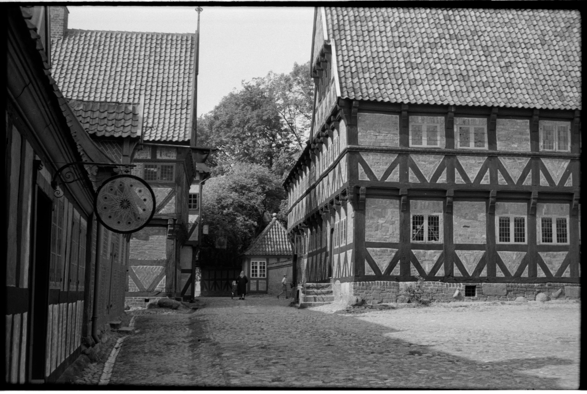 Husbyggnader och kullerstensgata vid Den Gamle By, friluftsmuseét i Århus.