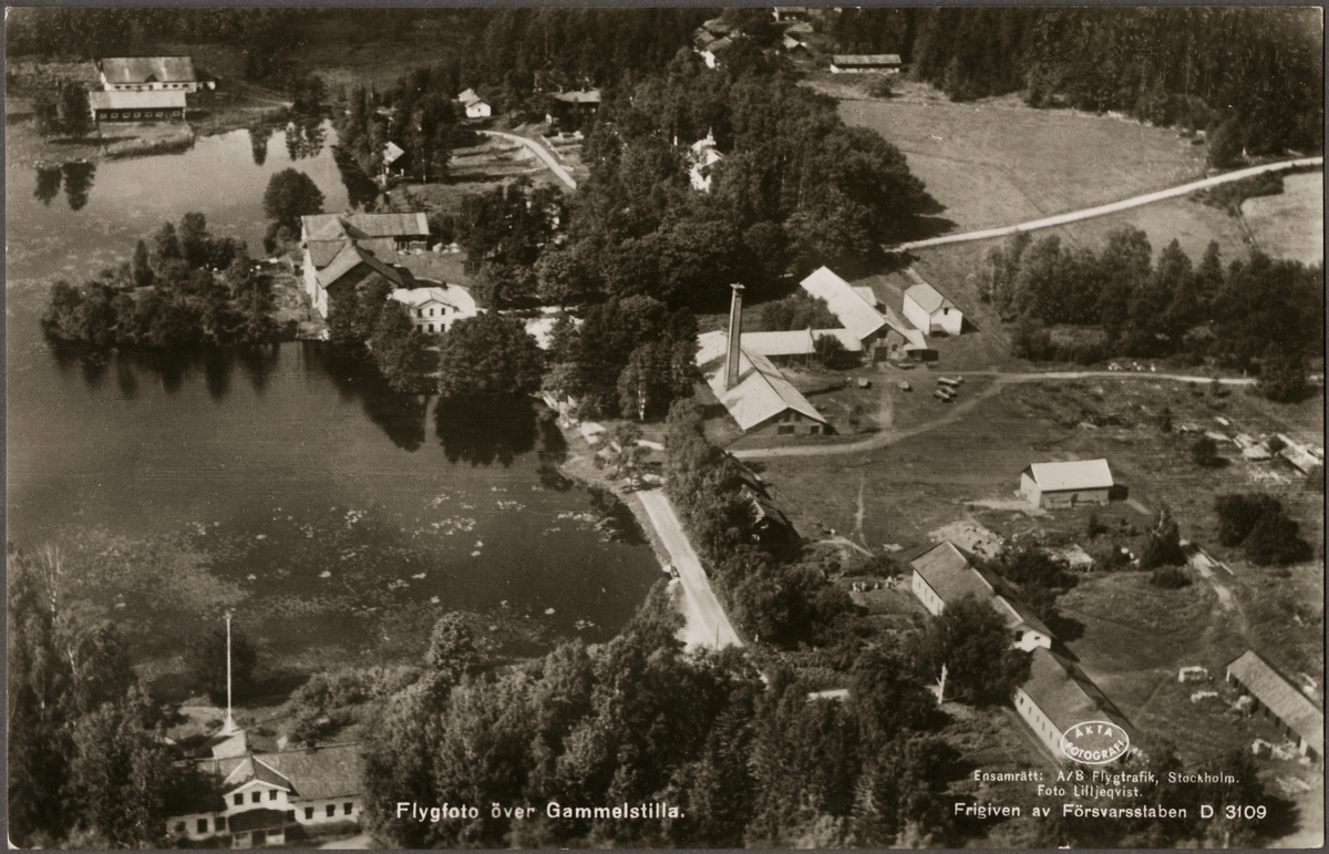 Vy över Gammelstilla by och sjön Nedre Dammen.