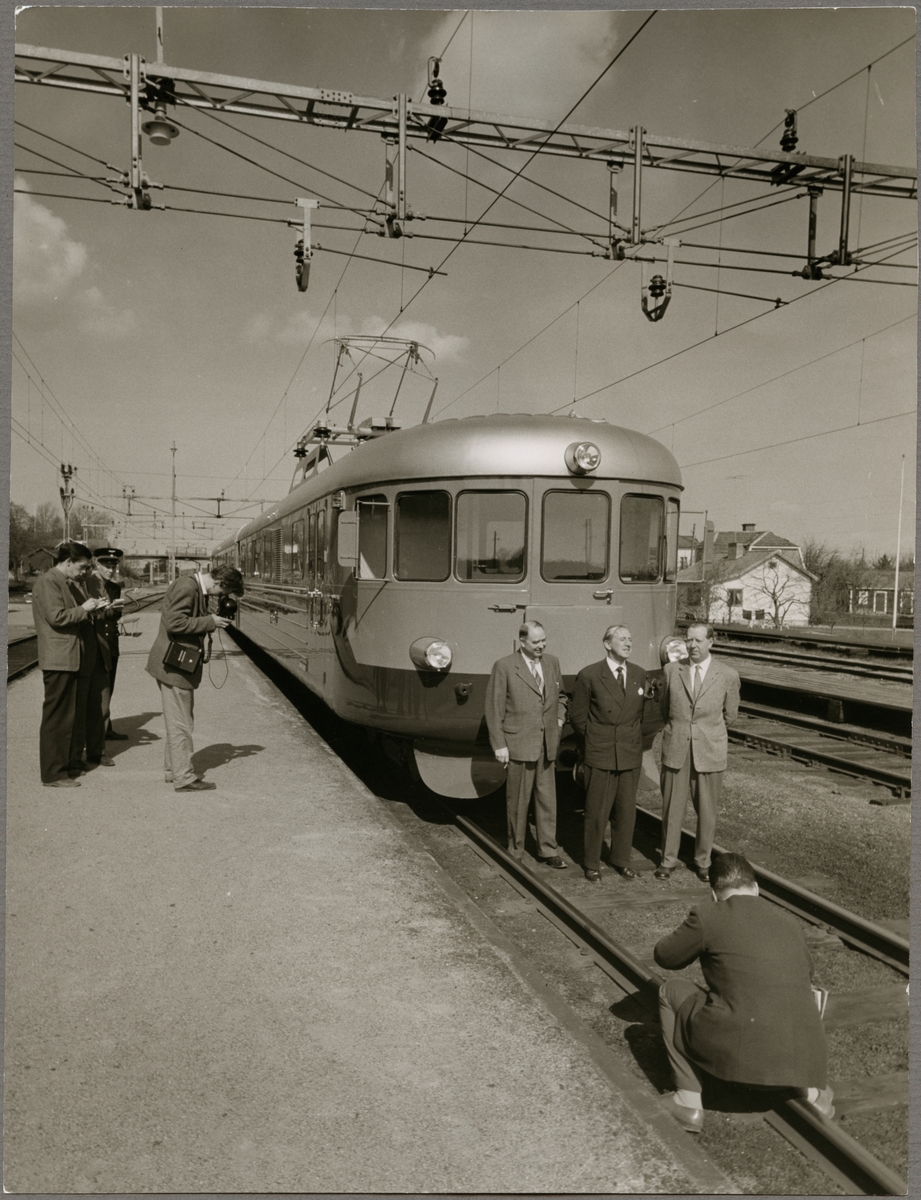 Gruppfoto framför rälsbusståg vid perrong.