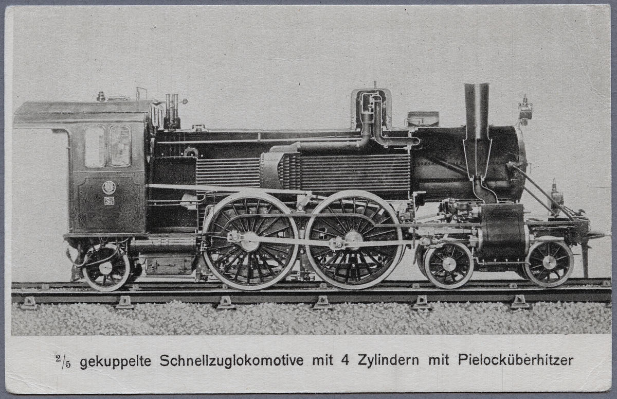 Tyskt ånglok, S5, fyra cylindrar. Genomskuret för att visa uppbyggnaden.