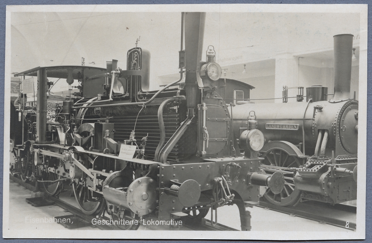 Tyska ånglok. Ett genomskuret lok för att visa insidan. Andra loket heter "Landwührden".