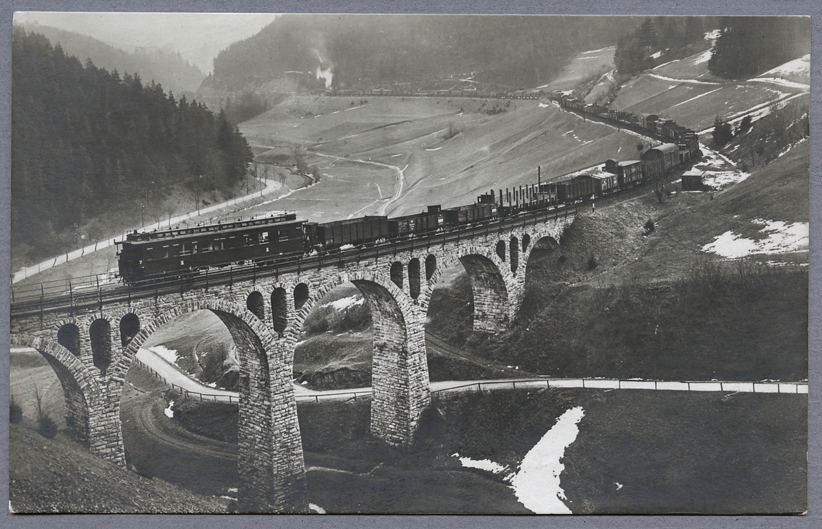 Godståg över järnvägsbro på banan Neuhaus am Rennweg - Probstzella.