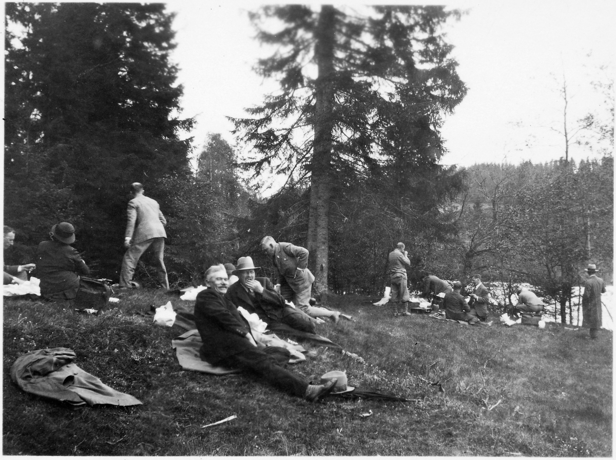 SJBF, Statens Järnvägars Befälsförbund, personalutflykt till Halden, Norge. Middagsrast vid sjön.
