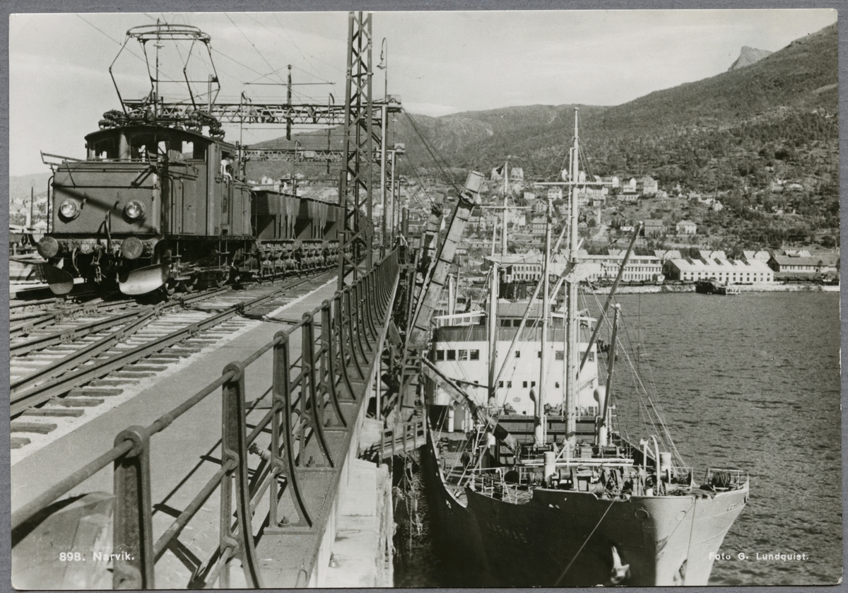 Malmhamnen i Narvik med "M/S Karmas" vid kaj. På bron syns ett ellok med malmvagnar. Luossavaara-Kiirunavaara Aktiebolag, LKAB F 29.