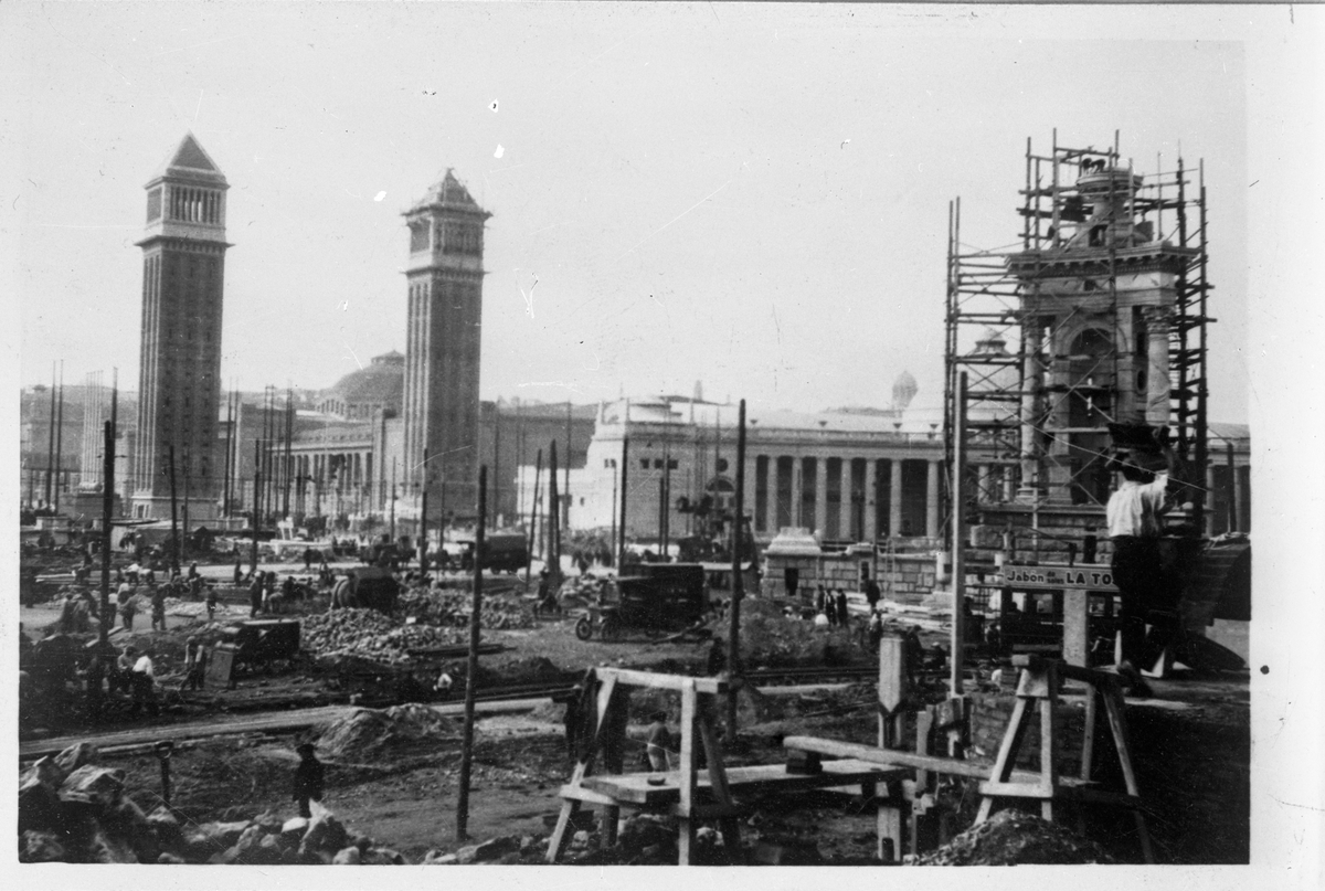 Vy från utställningsområdet under uppbyggnad. Världsutställningen i Barcelona 1929.