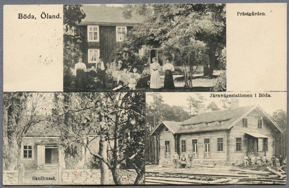 Fotografier av prästgården, skolhuset och järnvägsstationen i Böda på Öland.