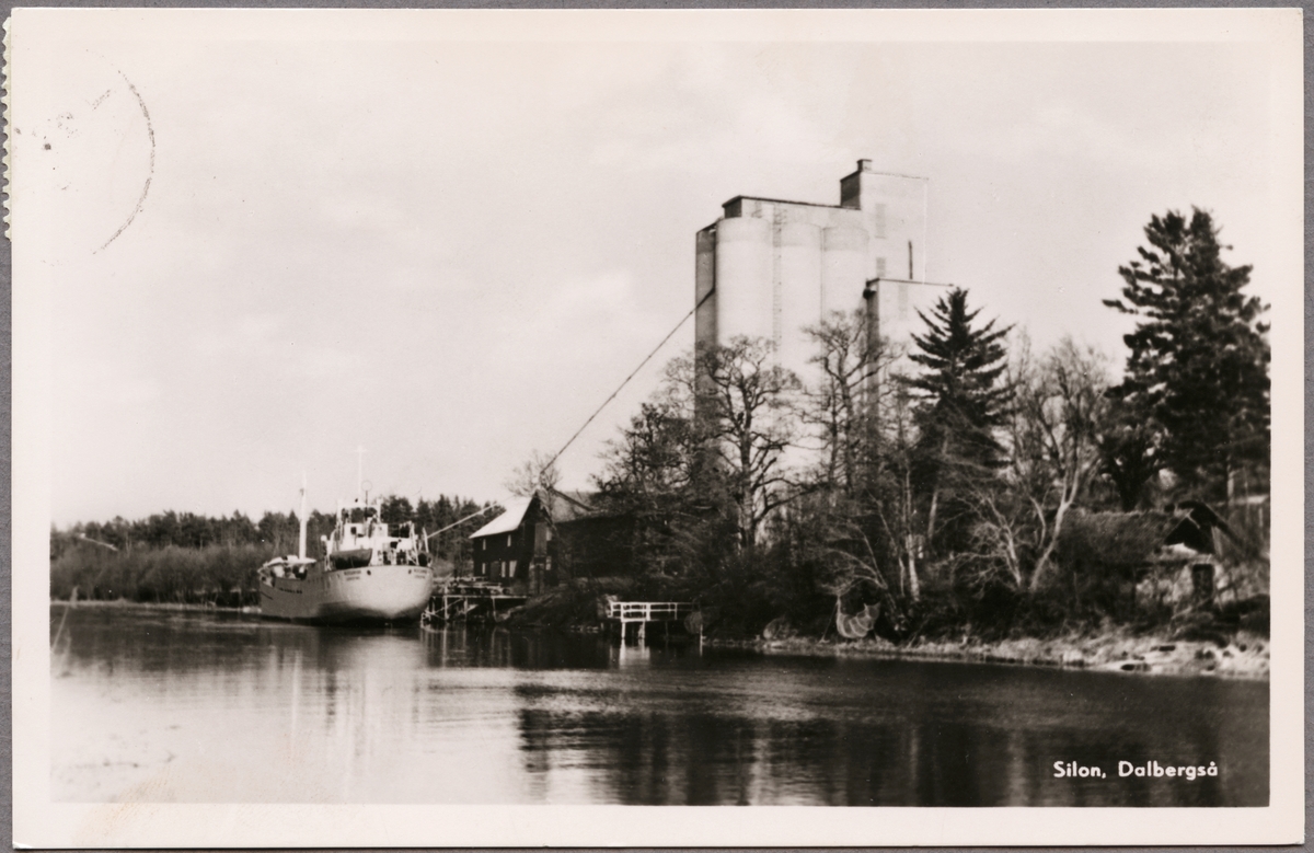 Silo vid Dalbergså med lastfartyg i bild.