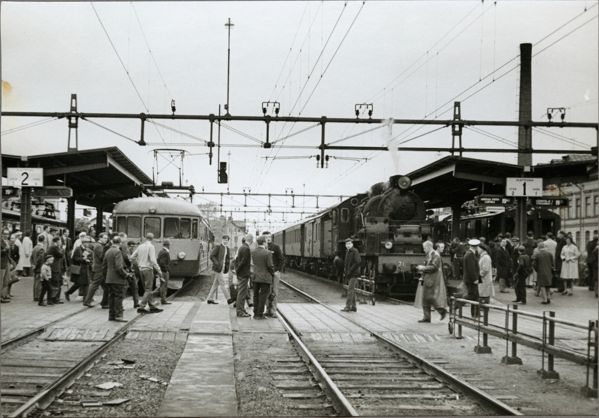 Trafikaktiebolaget Grängesberg - Oxelösunds Järnvägar, TGOJ M3t 71, gör uppehåll på Eskilstuna Centralstation. Bredvid står en motorvagn typ X16/X17.