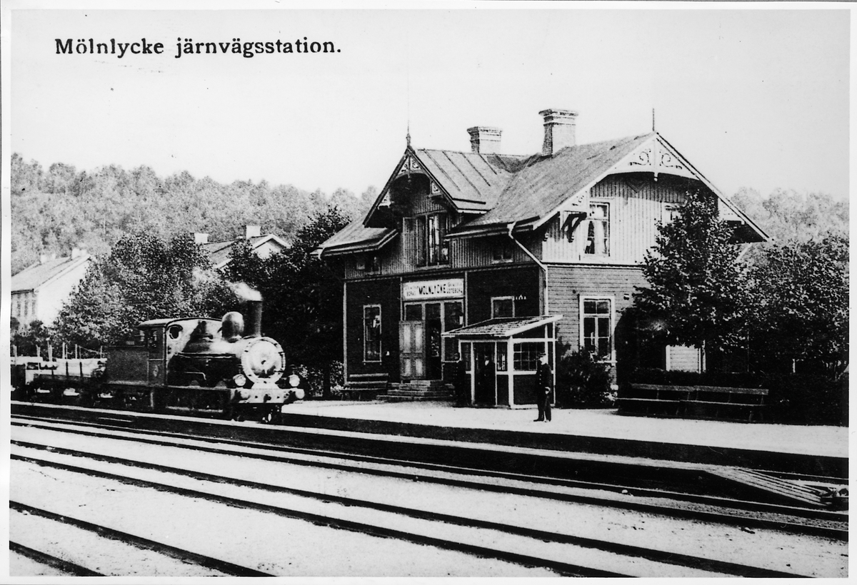 Mölnlycke station. Göteborg - Borås Järnvägar, GBJ K 2. Loket tillverkades 1893 av Nohab, skrotat 1943.