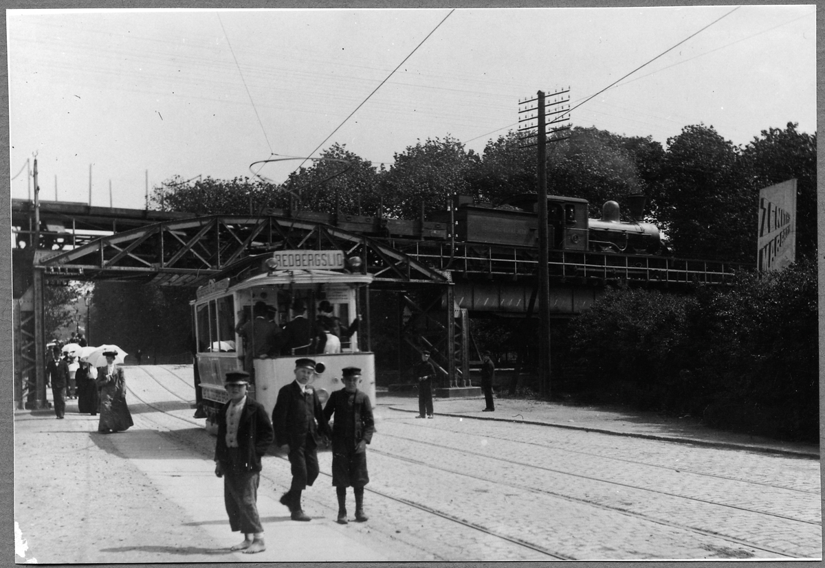 Göteborg - Borås Järnvägar, GBJ K 5. Ångloket med godståg på viadukten över Redbergsvägen i Göteborg. GS spårvagn typ M1.