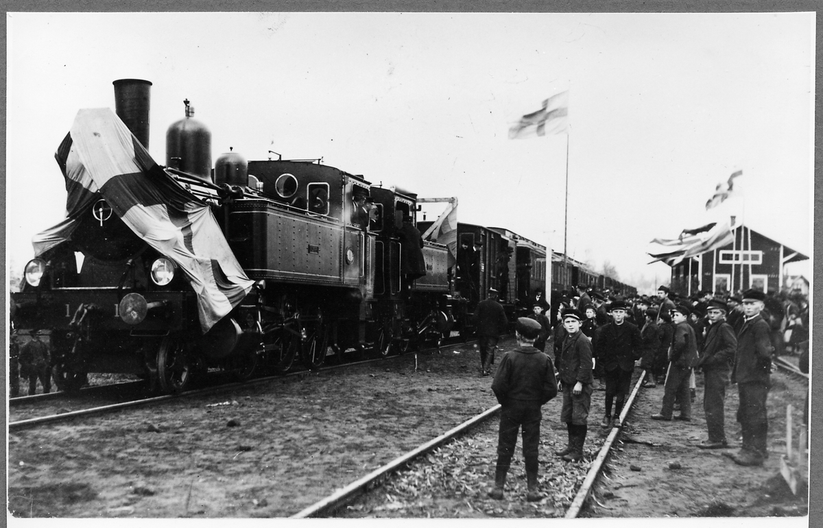 Tidaholms järnväg, TJ lok 1 "Vulcan" och TJ lok 2 "Tidaholm" vid järnvägens invigning i Tidaholm år 1906.
