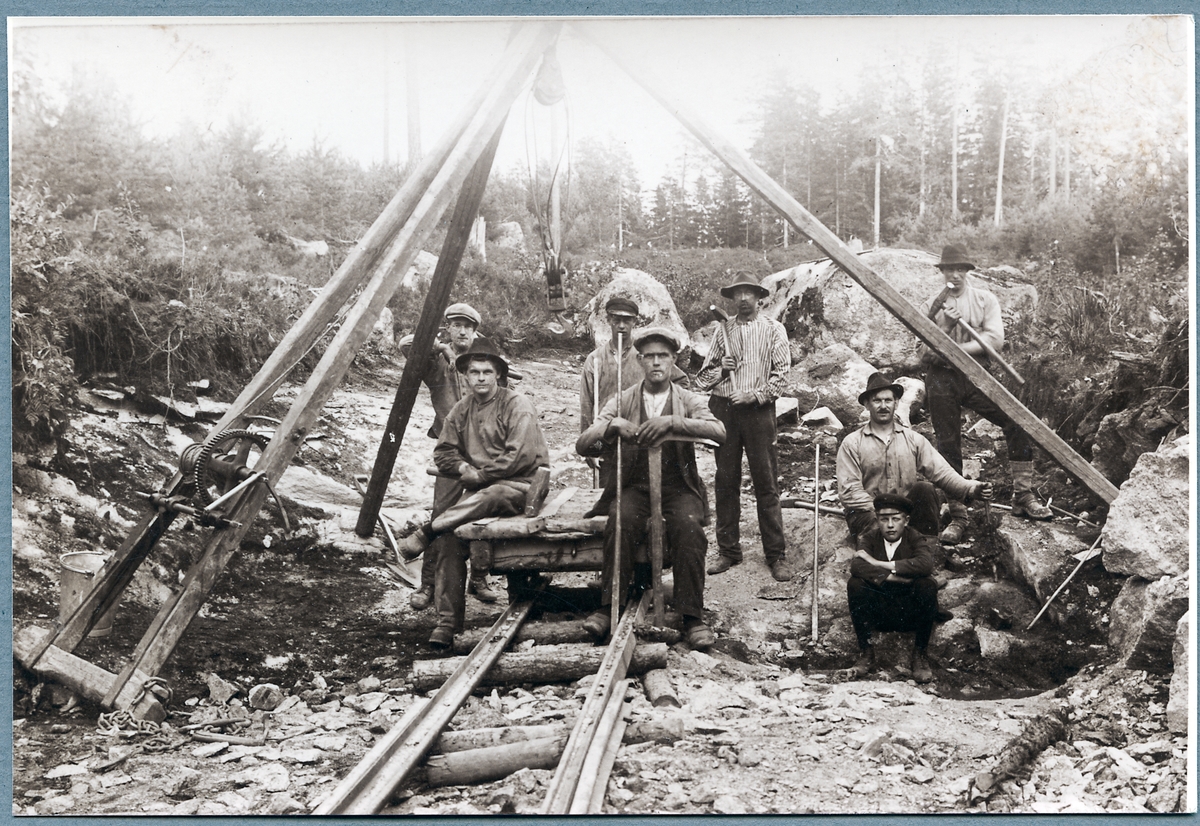 Arbetare vid bygget Vimmerby - Ydre Järnväg uppställda för fotografering. Sittande till vänster i bild Jakob Melander.