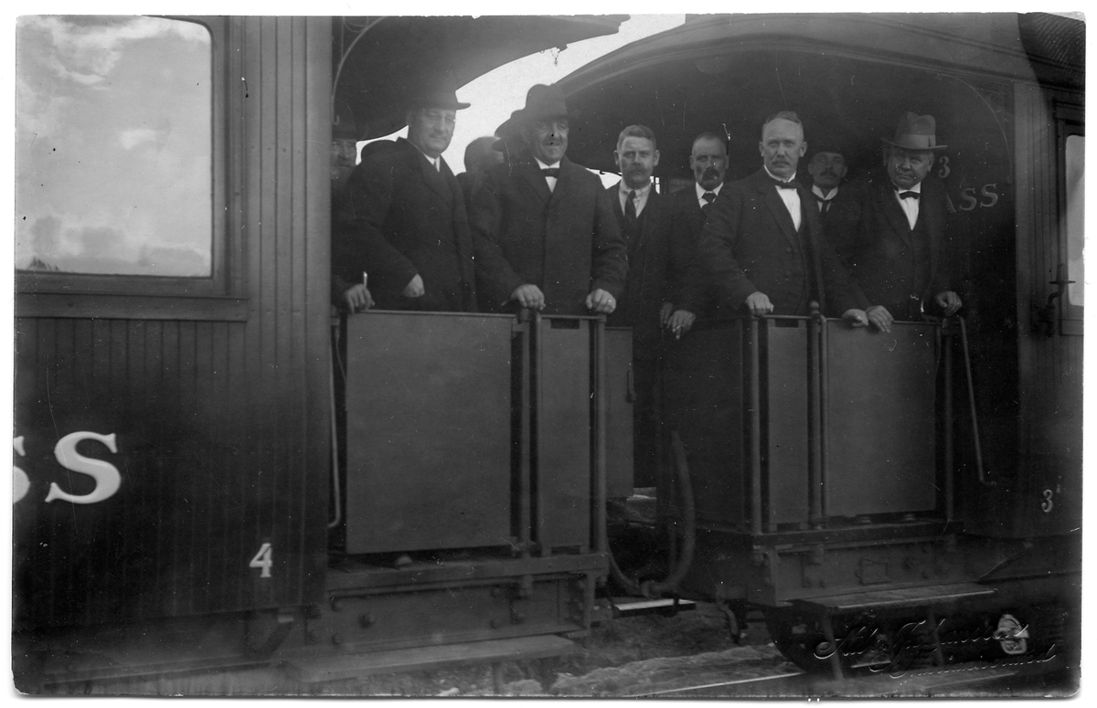 Titel: Invigning av Vimmerby - Ydre Järnväg. Järnvägens styrelse ombord på invigningståget.
