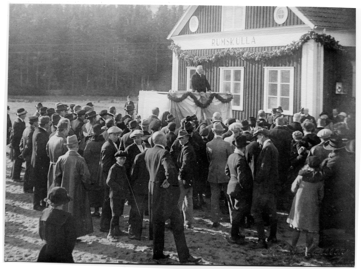 Rumskulla station vid invigningen. Landshövding Falk från Kalmar i talarstolen.