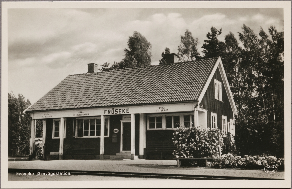 Spårsida av stationshus med spår i bild.