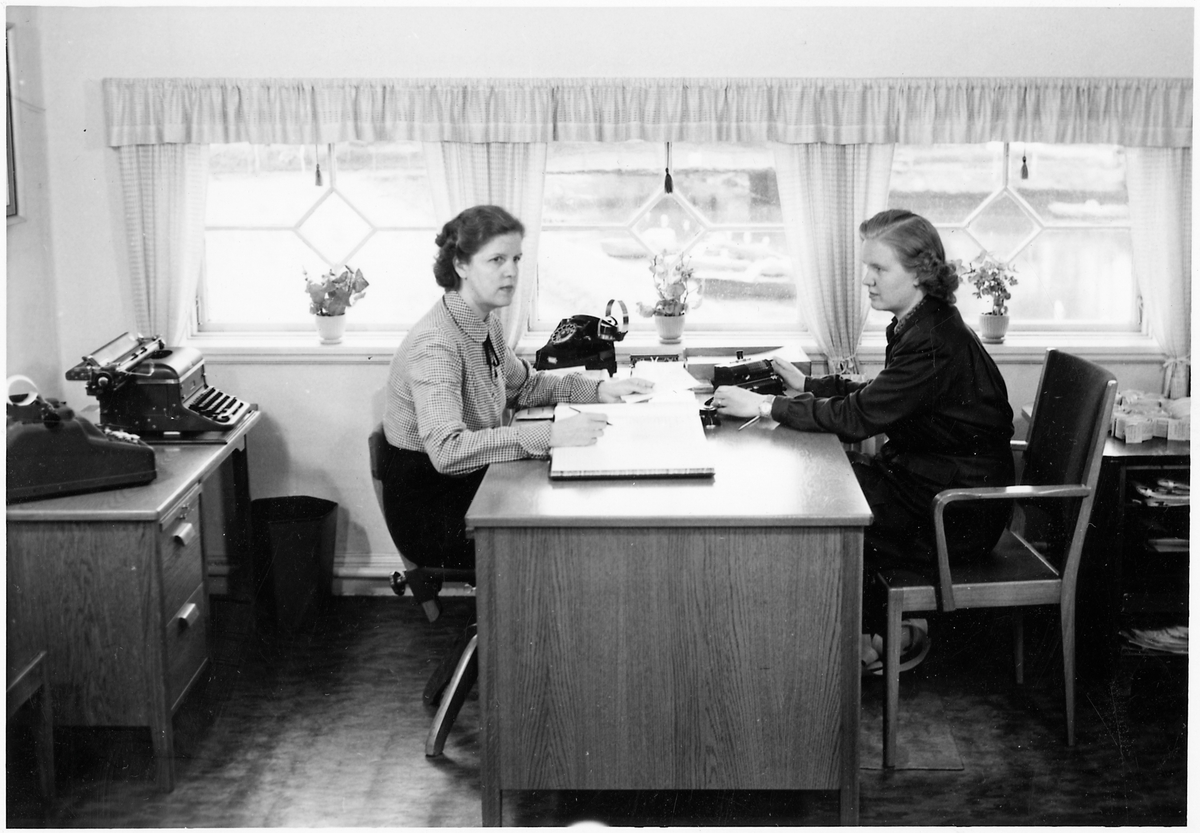 Fru I. Karlsson och fru Viola Lundin på Köping - Uttersberg - Riddarhyttans Järnvägar, KURJ:s busskontor.