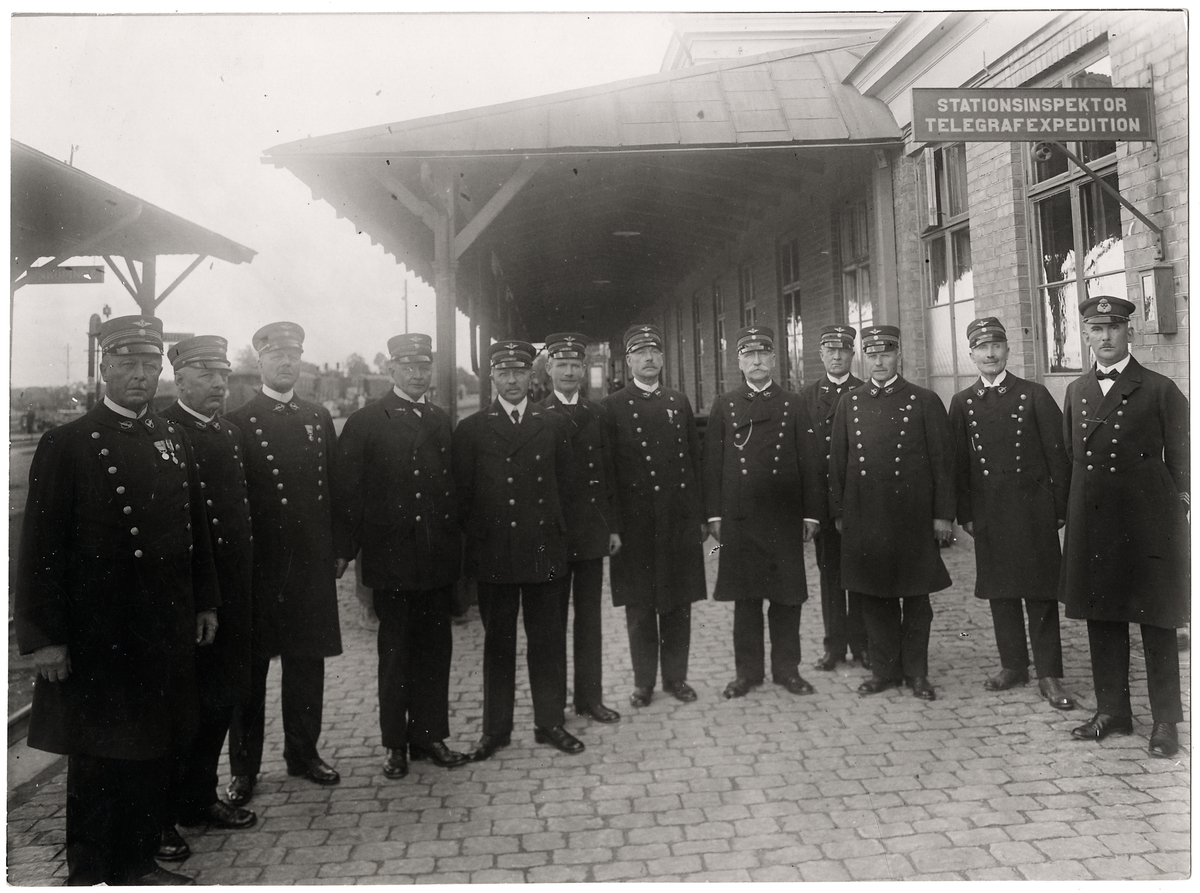 Stationsinspektor Gustaf Dahlström och konduktörspersonal i Linköping.
