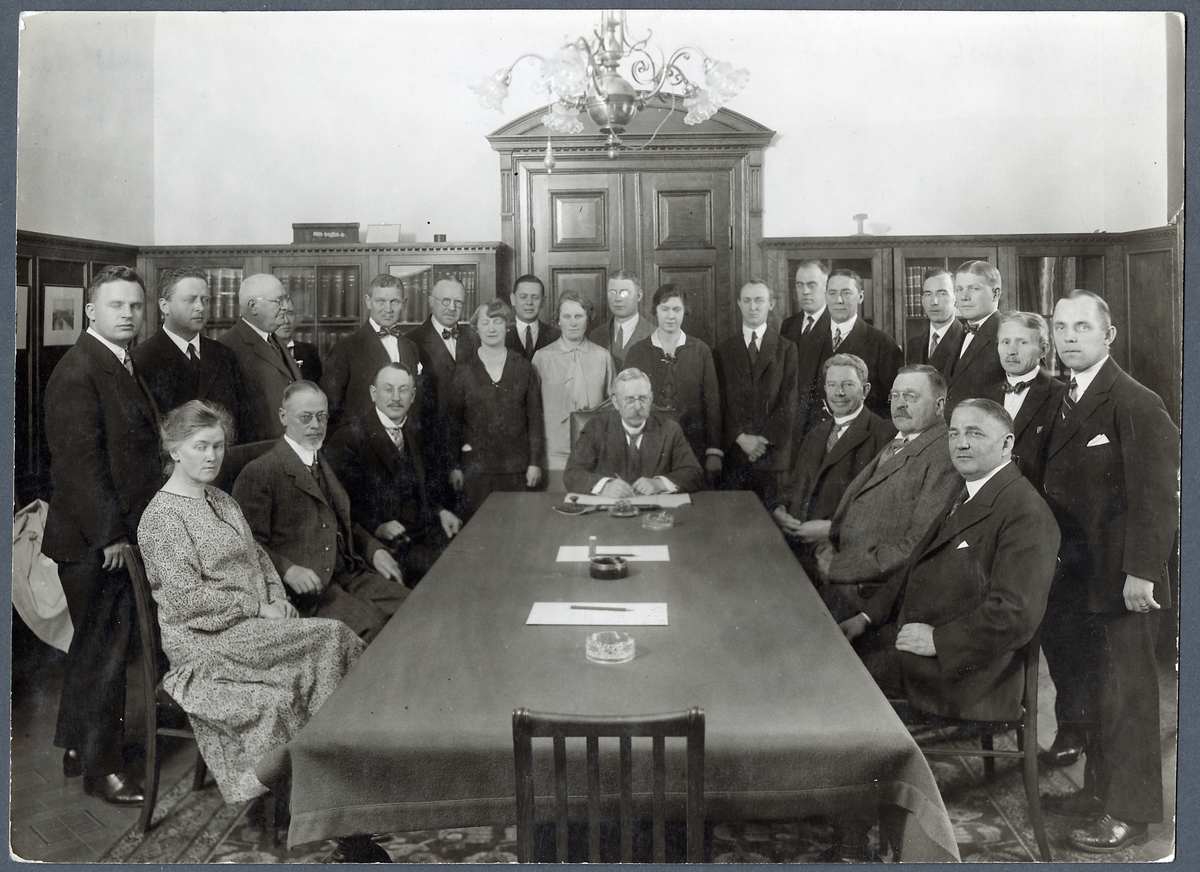 Grupporträtt på arbetslag med Distriktschef Ekman vid kortändan av bordet, i Malmö.