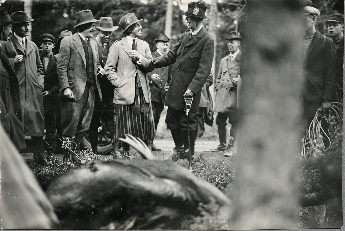 Titel: Konung Gustaf V gratulerar Konung Alfons XIII till hans första älg.