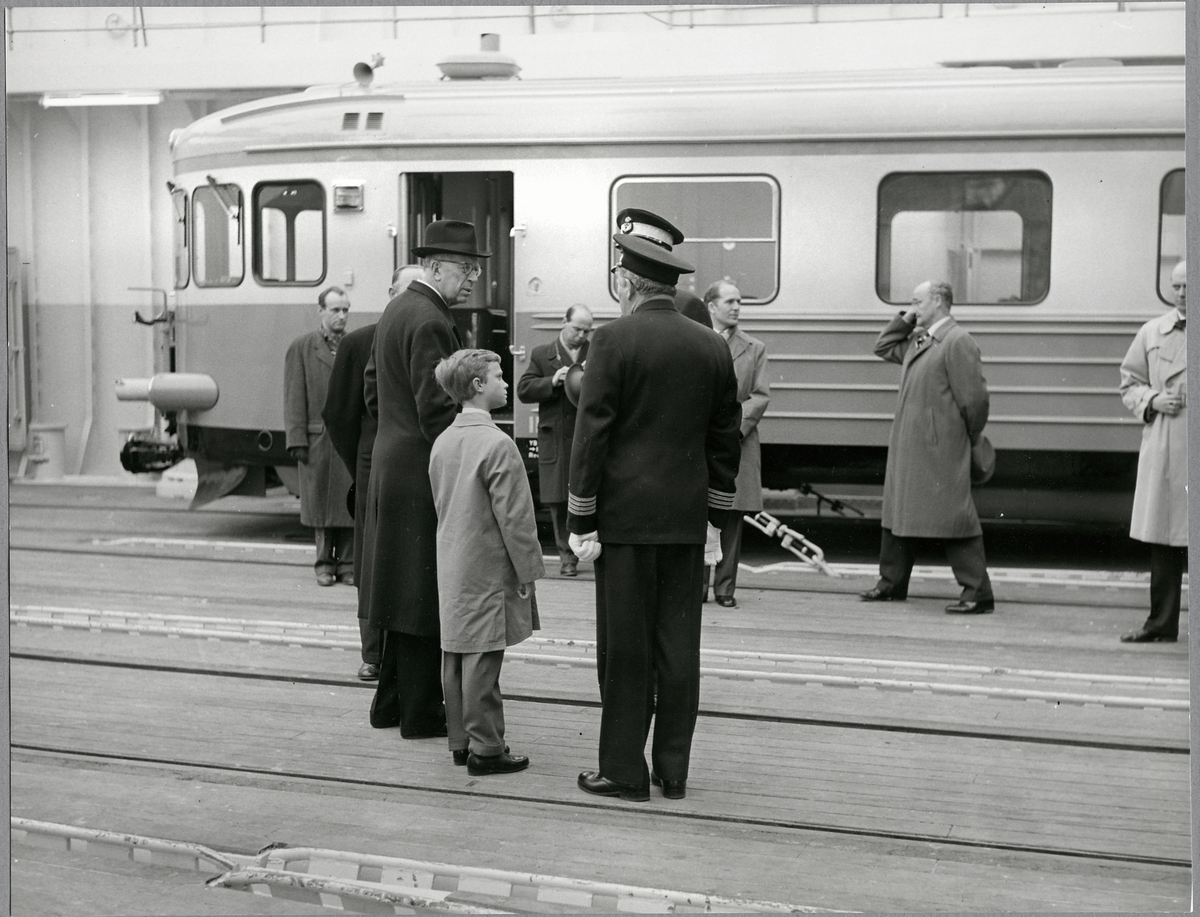 Titel: Konung Gustaf VI Adolf ombord på tågfärjan Trelleborg.