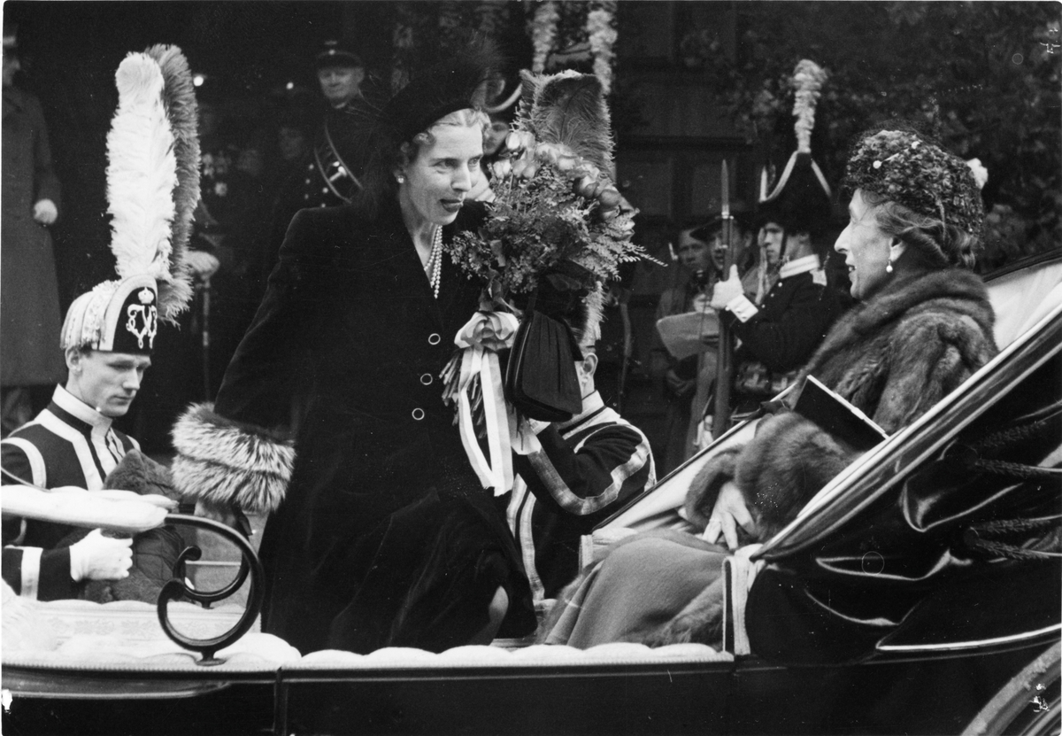 Drottning Ingrid av Dannmark kliver på kortegevagn för åktur tillsammans med prinsessan Ingeborg.