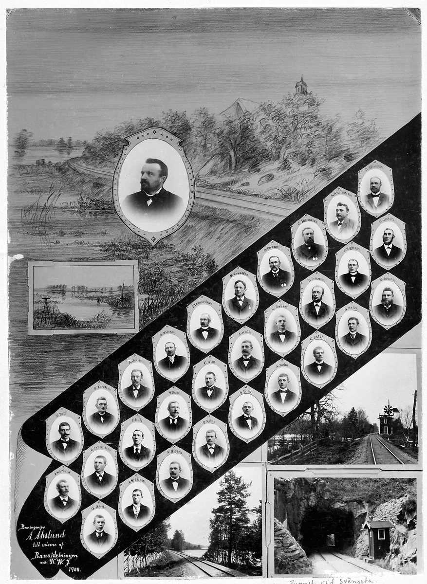 Baningeniör A. Åhslund med banavdelningens personal vid Karlshamn - Vislanda Järnveg, KWJ.