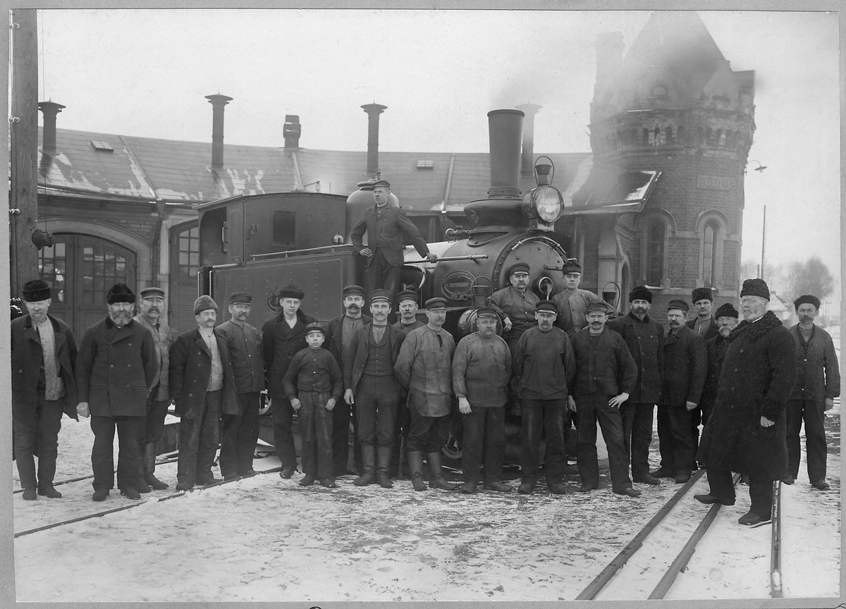 Verkstadspersonal i Köping. Köping - Uttersbergs Järnväg, KUJ lok 8.
