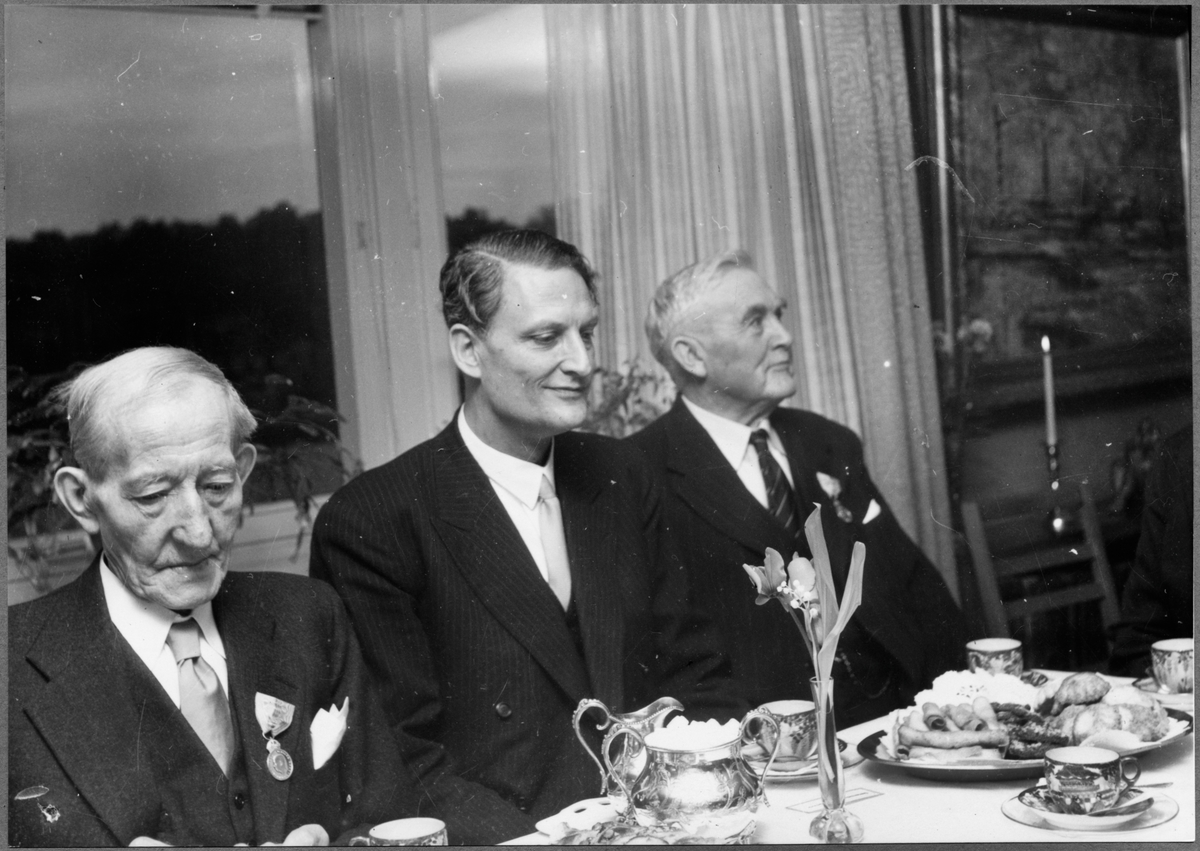 Medaljutdelning till Stockholm - Roslagens Järnvägar, SRJ: personal. Medaljörerna i Verkstadsdirektör Åke Nerells hem i Stocksund.