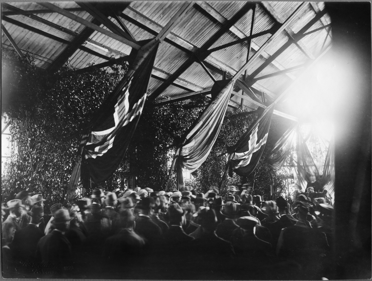 Malmbanans elektrifiering. Generaldirektör Granholm håller tal vid Riksgränsen under besiktningsresan Svartön - Riksgränsen - Narvik.