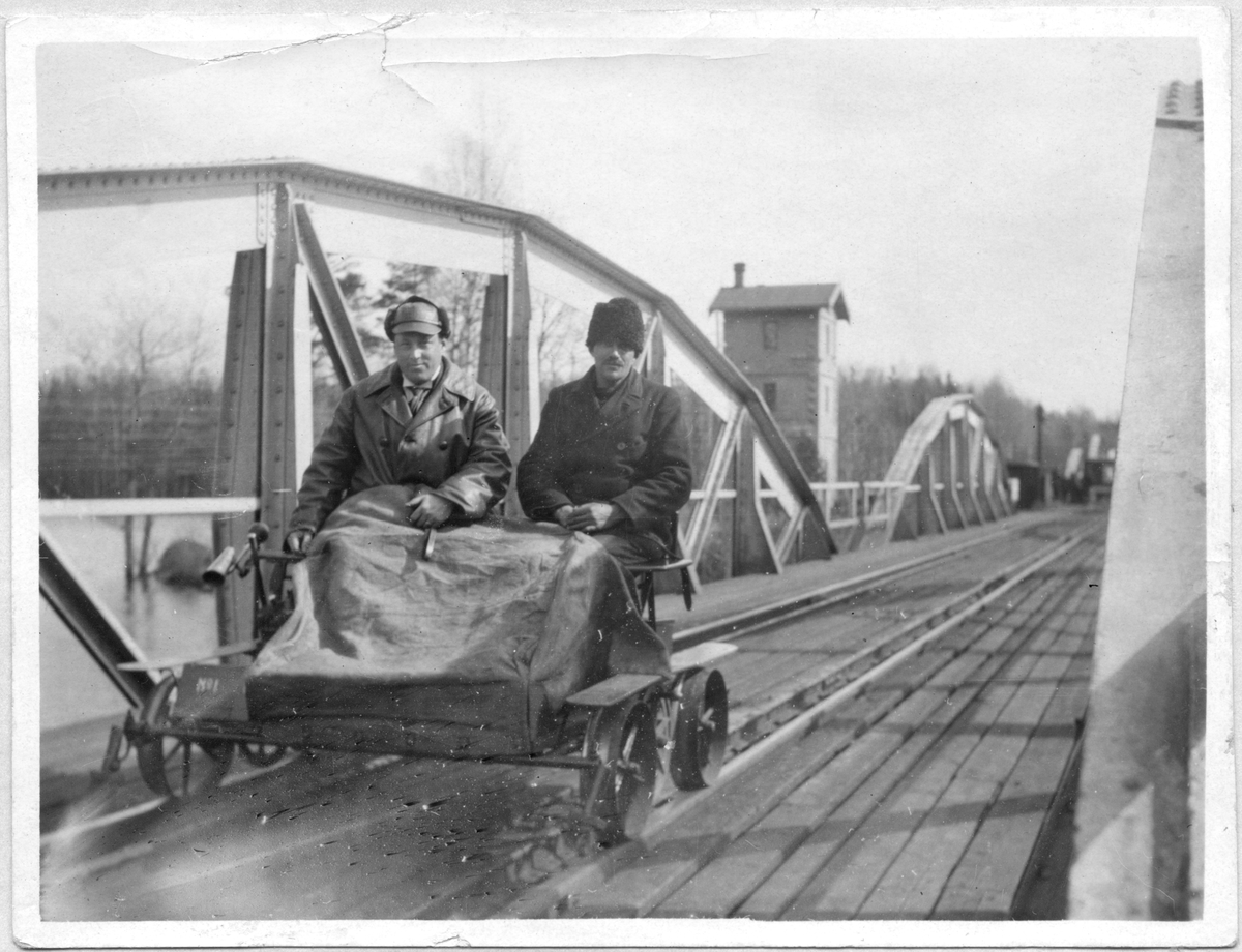 Inspektion Uppsala - Gävle Järnväg. Telegrafföreståndare T. Spångberg och reparatör R. Jansson i motordressin på bro över Dalälven vid Älvkarleö.